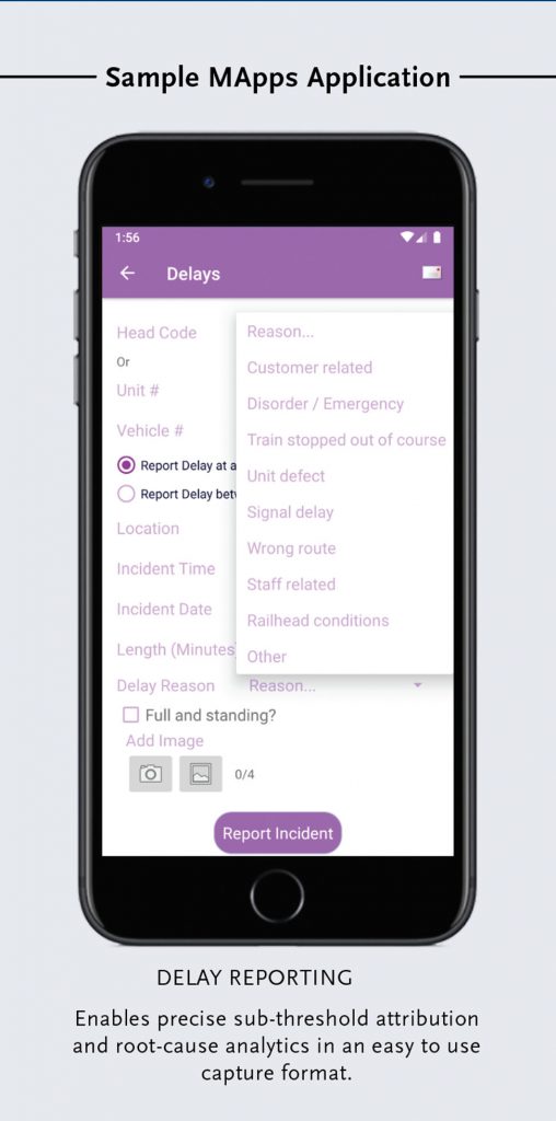 MApps (Mobile Application Suite) provides applications to rail staff which revolutionise manual and labour-intensive reporting processes. Additionally MApps can be used to provide journey information to passengers way beyond current capabilities