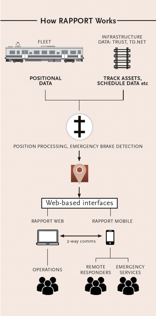 By integrating innovative technology to existing systems, RAPPORT (Real-time, Accelerated Position and Protection of Rail Transport) delivers a ‘single source of truth’ to Incident Response Teams (including emergency services) and Control functions which provides instant visibility and end-to-end management of an incident from the first alert through to the service recovery phase.